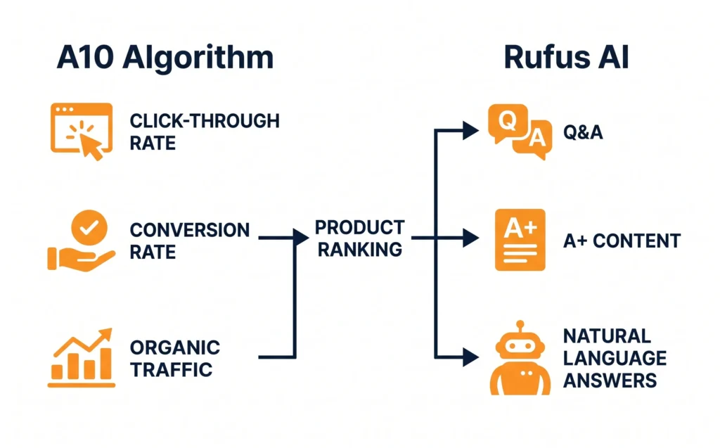 The Amazon A10 algorithm and Rufus now work together as a two-layer system. A10 decides your organic search rank. Rufus decides whether you get recommended in AI-driven answers.
