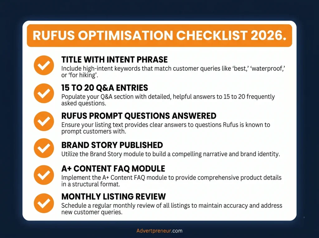 Check your Rufus prompt questions monthly. Amazon updates these regularly based on shifting buyer behaviour. When the questions change, update your bullets, Q&A, and A+ Content to match. Also revisit your listing after every product review batch. New negative reviews often reveal gaps that Rufus is currently unable to answer from your content.
