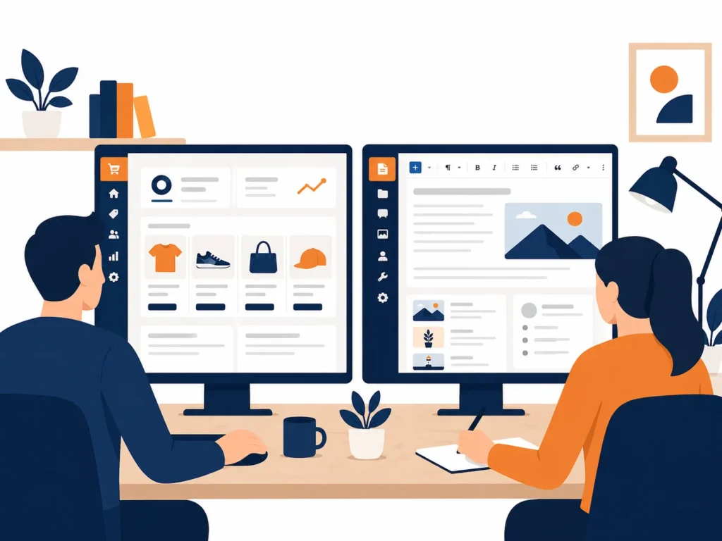 Shopify vs WordPress platform comparison illustration showing ecommerce dashboard and content management side by side